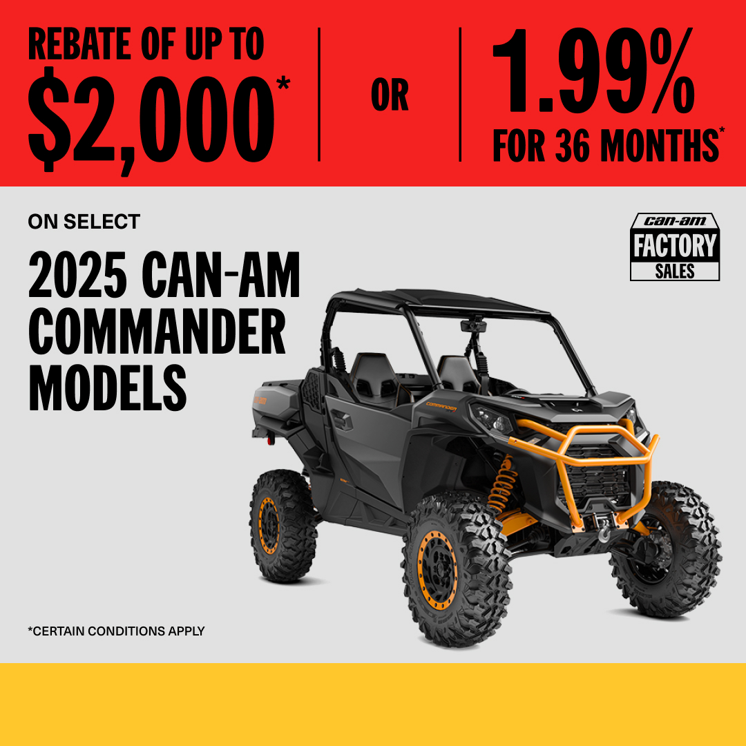 Up to $2,000 Rebate1.99% APR financing available for 36 Months on select 2025 Can-Am Commander Models VIEW INVENTORY View DisclaimerExpires 10/31/2025. Rates as low as 1.99% APR (Annual Percentage Rate) for 36 months. Examples of monthly payments required over a 36‑month term at a 1.99% APR rate: $28.64 per $1,000 financed. An example of a monthly payment with $3,000 down, no rebate, an APR of 1.99% for 36 months at an MSRP of $30,000 is $773.23/mo. Total cost of borrowing $836.34 with a total repayment obligation of $27,836.34. Down payment may be required. Other financing offers may be available. Minimum and Maximum Amount Financed may vary. Not all buyers will qualify. Higher rates apply for buyers with lower credit ratings. Other qualifications and restrictions may apply, depending on the participating financial institution(s). BRP is not responsible for any of the financing terms and conditions. This offer is in lieu of any other promotion. Prices exclude tax, tag, title, dealer fees and dealer added options and accessories. Vehicle art depicted is for the purpose of advertising and may not be representative of actual vehicle(s) in stock. Subject to availability.