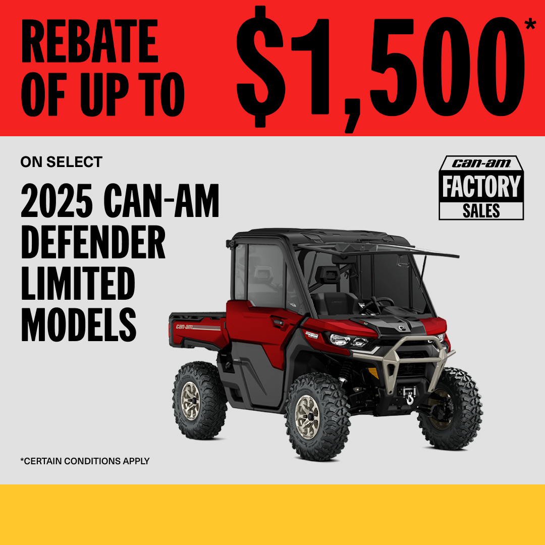 Up to $1,500 RebateAvailable on select 2025 Can-Am Defender Limited models VIEW INVENTORY View DisclaimerExpires 10/31/2025. Prices exclude tax, tag, title, dealer fees and dealer added options and accessories. Vehicle art depicted is for the purpose of advertising and may not be representative of actual vehicle(s) in stock. Subject to availability.