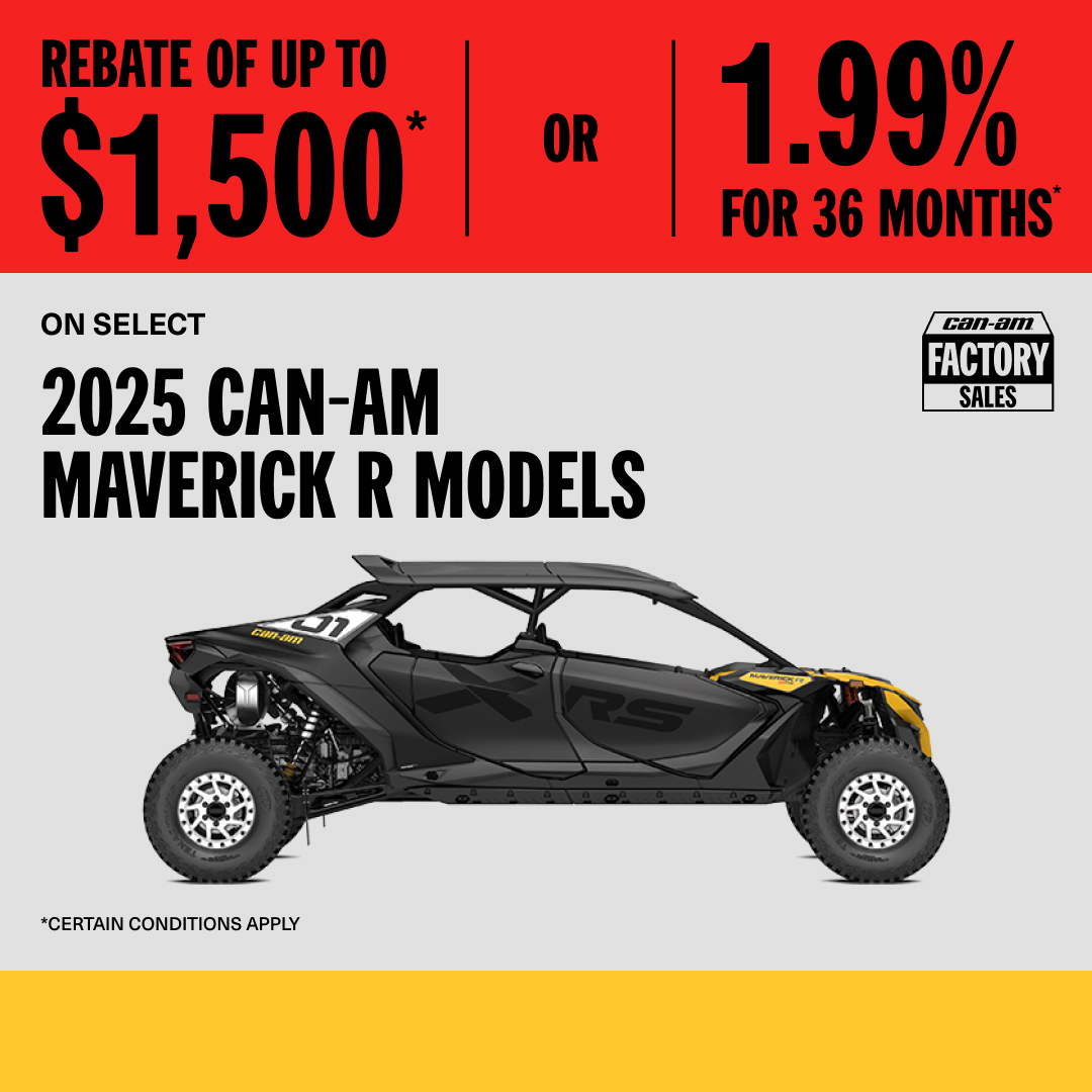 Up to $1,500 Rebate1.99% APR available for 36 months on select 2025 Can-Am Maverick R models VIEW INVENTORY View DisclaimerRates as low as 1.99% APR (Annual Percentage Rate) for 36 months. Examples of monthly payments required over a 36‑month term at a 1.99% APR rate: $28.64 per $1,000 financed. An example of a monthly payment with $3,000 down, no rebate, an APR of 1.99% for 36 months at an MSRP of $30,000 is $773.23/mo. Total cost of borrowing $836.34 with a total repayment obligation of $27,836.34. Down payment may be required. Other financing offers may be available. Minimum and Maximum Amount Financed may vary. Not all buyers will qualify. Higher rates apply for buyers with lower credit ratings. Other qualifications and restrictions may apply, depending on the participating financial institution(s). BRP is not responsible for any of the financing terms and conditions. This offer is in lieu of any other promotion. Expires 10/31/2025. Prices exclude tax, tag, title, dealer fees and dealer added options and accessories. Vehicle art depicted is for the purpose of advertising and may not be representative of actual vehicle(s) in stock. Subject to availability.