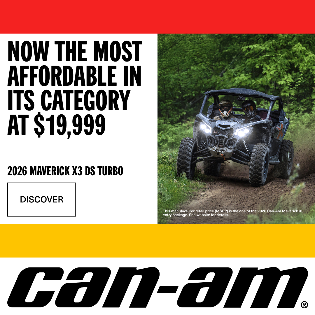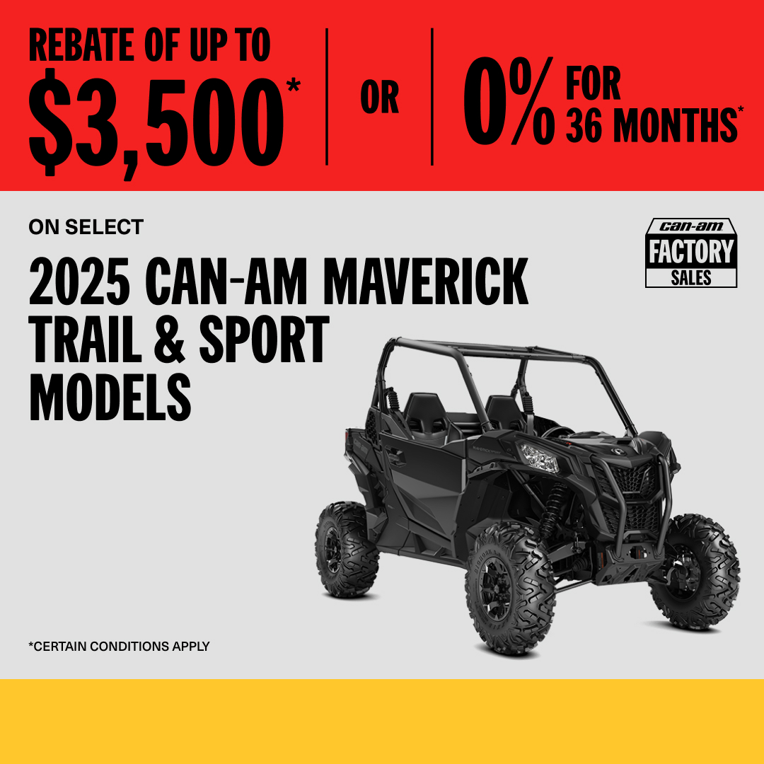 Up to $3,500 Rebate0% APR available for 36 months on select 2025 Can-Am Maverick Trail & Sport models VIEW INVENTORY View DisclaimerRates as low as 0% APR (Annual Percentage Rate) for 36 months. Examples of monthly payments required over a 36‑month term at a 0% APR rate: $27.78 per $1,000 financed. An example of a monthly payment with $3,000 down, no rebate, an APR of 0% for 36 months at an MSRP of $30,000 is $750/mo. Total cost of borrowing $0 with a total repayment obligation of $27,000. Down payment may be required. Other financing offers may be available. Minimum and Maximum Amount Financed may vary. Not all buyers will qualify. Higher rates apply for buyers with lower credit ratings. Other qualifications and restrictions may apply, depending on the participating financial institution(s). BRP is not responsible for any of the financing terms and conditions. This offer is in lieu of any other promotion. Expires 10/31/2025. Prices exclude tax, tag, title, dealer fees and dealer added options and accessories. Vehicle art depicted is for the purpose of advertising and may not be representative of actual vehicle(s) in stock. Subject to availability.