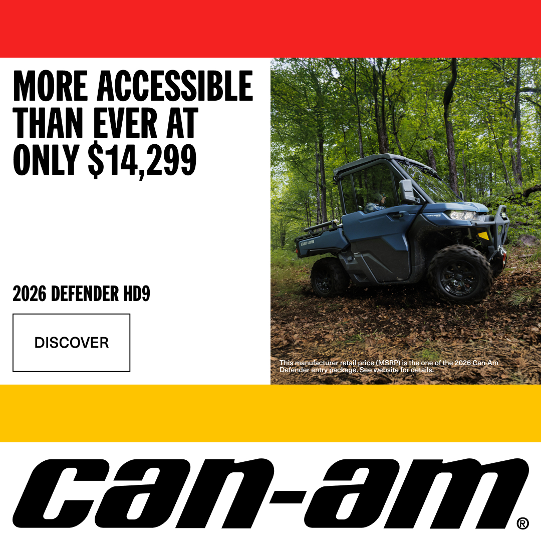 Up to $3,500 Rebate0% APR financing available for 36 Months on select 2025 Can-Am Defender models VIEW INVENTORY View DisclaimerAvailable on 2025 Defender DPS CAB. Rates as low as 0% APR (Annual Percentage Rate) for 36 months. Examples of monthly payments required over a 36‑month term at a 0% APR rate: $27.78 per $1,000 financed. An example of a monthly payment with $3,000 down, no rebate, an APR of 0% for 36 months at an MSRP of $30,000 is $750/mo. Total cost of borrowing $0 with a total repayment obligation of $27,000. Down payment may be required. Other financing offers may be available. Minimum and Maximum Amount Financed may vary. Not all buyers will qualify. Higher rates apply for buyers with lower credit ratings. Other qualifications and restrictions may apply, depending on the participating financial institution(s). BRP is not responsible for any of the financing terms and conditions. This offer is in lieu of any other promotion. Expires 10/31/2025. Prices exclude tax, tag, title, dealer fees and dealer added options and accessories. Vehicle art depicted is for the purpose of advertising and may not be representative of actual vehicle(s) in stock. Subject to availability.
