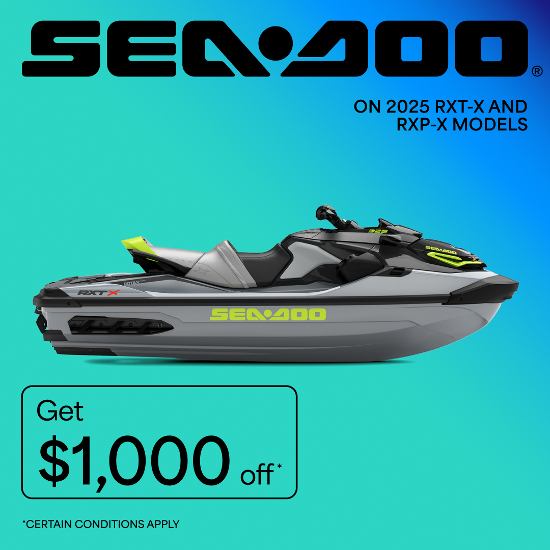 $1,000 OffConsumers who purchase new and unused 2025 Sea-Doo RXP or RXT models are eligible to a $1,000 rebate View Inventory View DisclaimerConsumers who purchase new and unused 2025 Sea-Doo RXP or RXT models are eligible to a $1,000 rebate. Expires 12/1/2025. Prices exclude tax, tag, title, dealer fees and dealer added options and accessories. Vehicle art depicted is for the purpose of advertising and may not be representative of actual vehicle(s) in stock. Subject to availability.