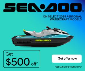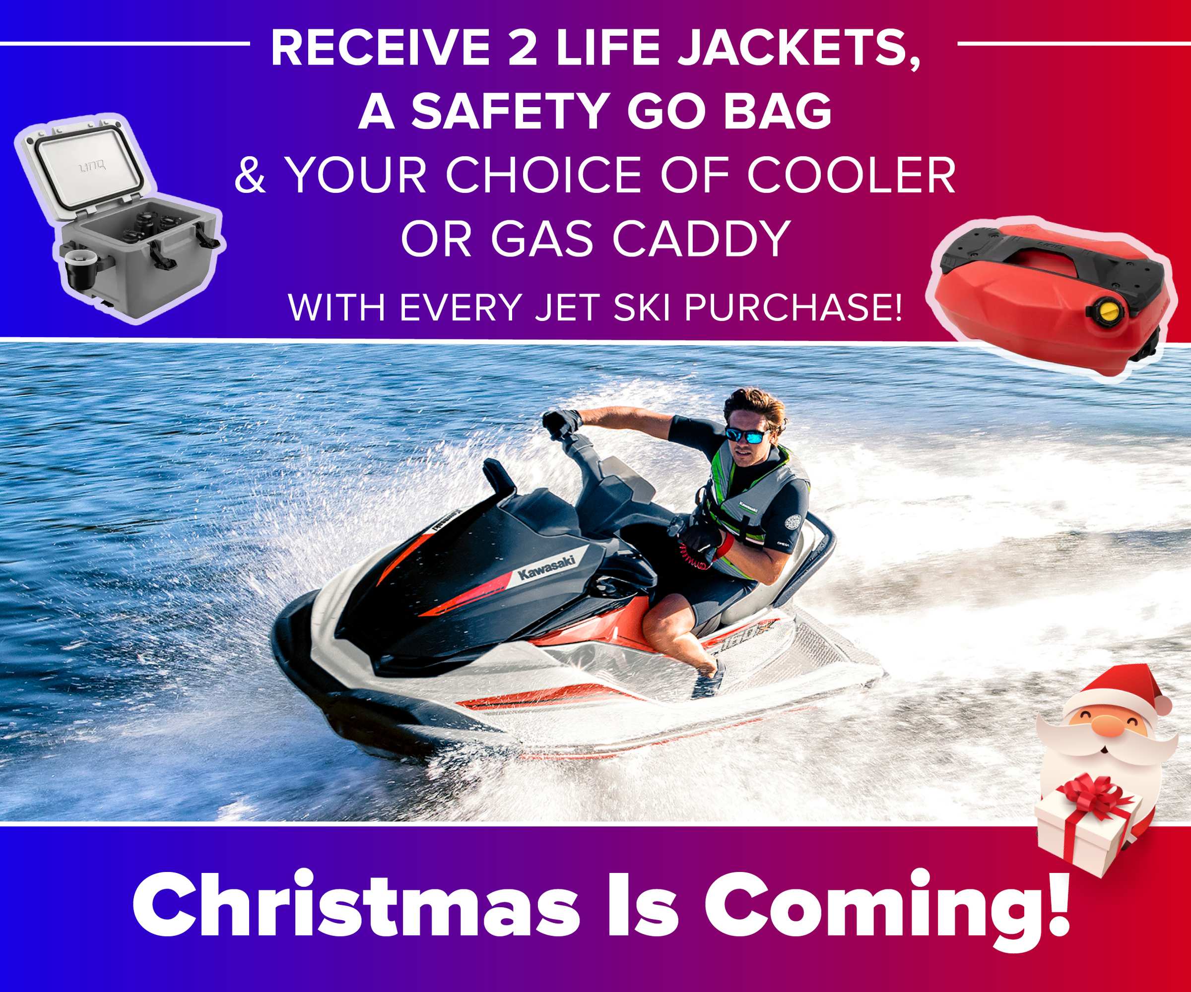 Receive two life jackets, a safety go bag, and your choice of a cooler or gas caddy with any new Jet Ski purchase!